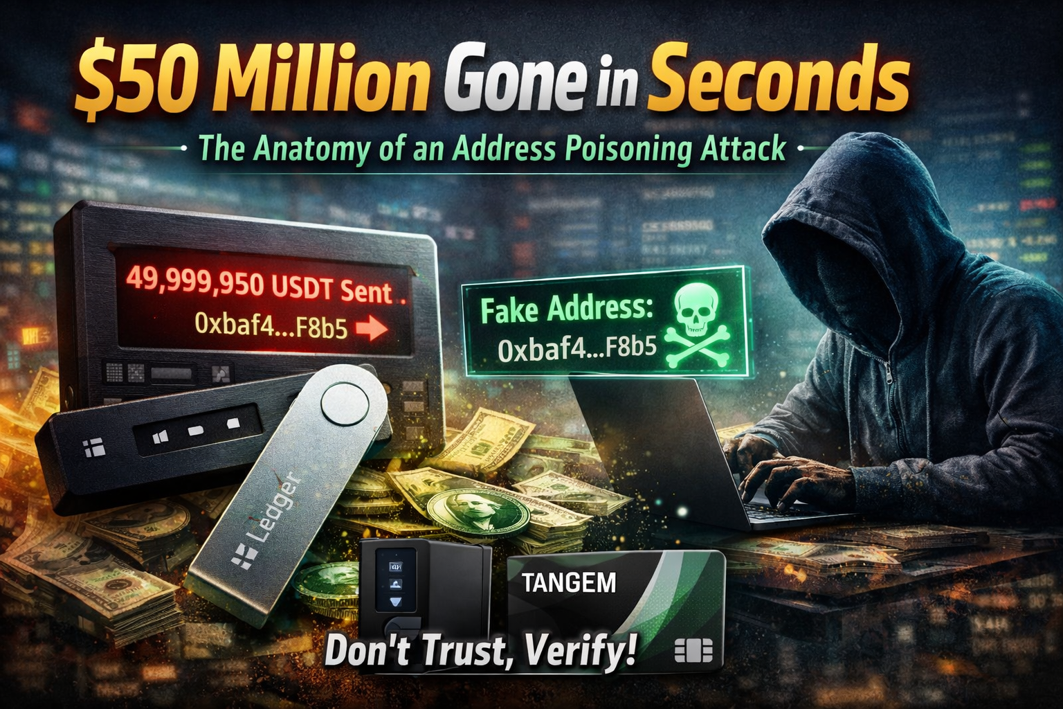 This report provides a forensic analysis of the incident, explaining exactly how attackers weaponize the "safety habits" of experienced users. We dissect the technical mechanics of vanity address generation and provide a definitive guide on how to secure your assets using hardware solutions like Ledger and Tangem.